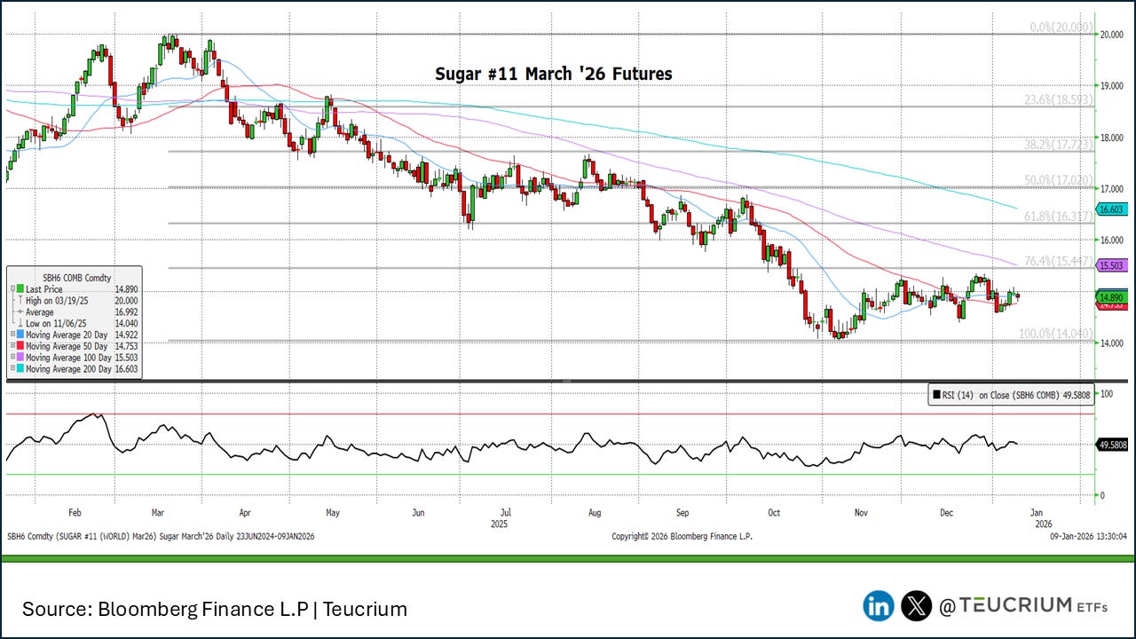 Sugar futures stabilized after an extended decline through 2025, finding support just above the $0.1400 level before rebounding to hover near the $0.1500 pivot. Technicals reflect a neutral posture, with RSI holding near 49.6 and the 20- and 50-day moving averages beginning to converge. Supportive headlines emerged following reports of lower yields from Brazil, sparking the recent bounce from contract lows.