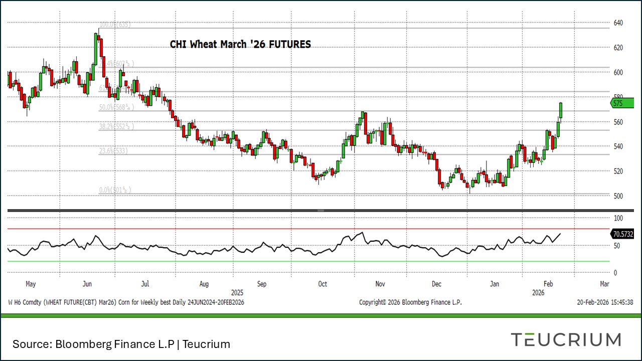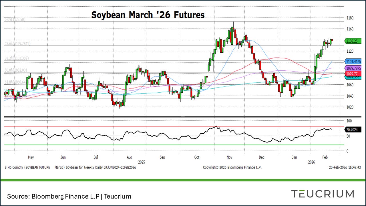 Soybean futures consolidated this week, holding near multi-month highs as the market digested conflicting fundamental signals. Strong domestic crush demand and a record January crush reported by NOPA continue to provide underlying support. However, the market’s upside was capped by the USDA’s Outlook Forum, which projected soybean acres at 85.0 million, a significant increase from the previous year. This forecast, combined with a rebound in expected exports, points toward adequate supplies for the upcoming season. Adding to the mixed sentiment, the Supreme Court’s decision to strike down Trump-era tariffs introduced volatility, sparking fears it could reduce China’s motivation for future purchases. For now, the market remains in a technical uptrend, supported by strong demand for soybean oil and meal.